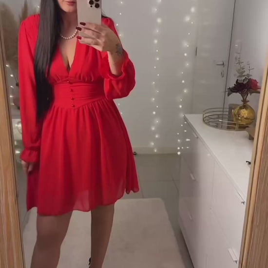 Robe Marley, rouge, unie, avec manches longues, boutons et doublure en viscose.