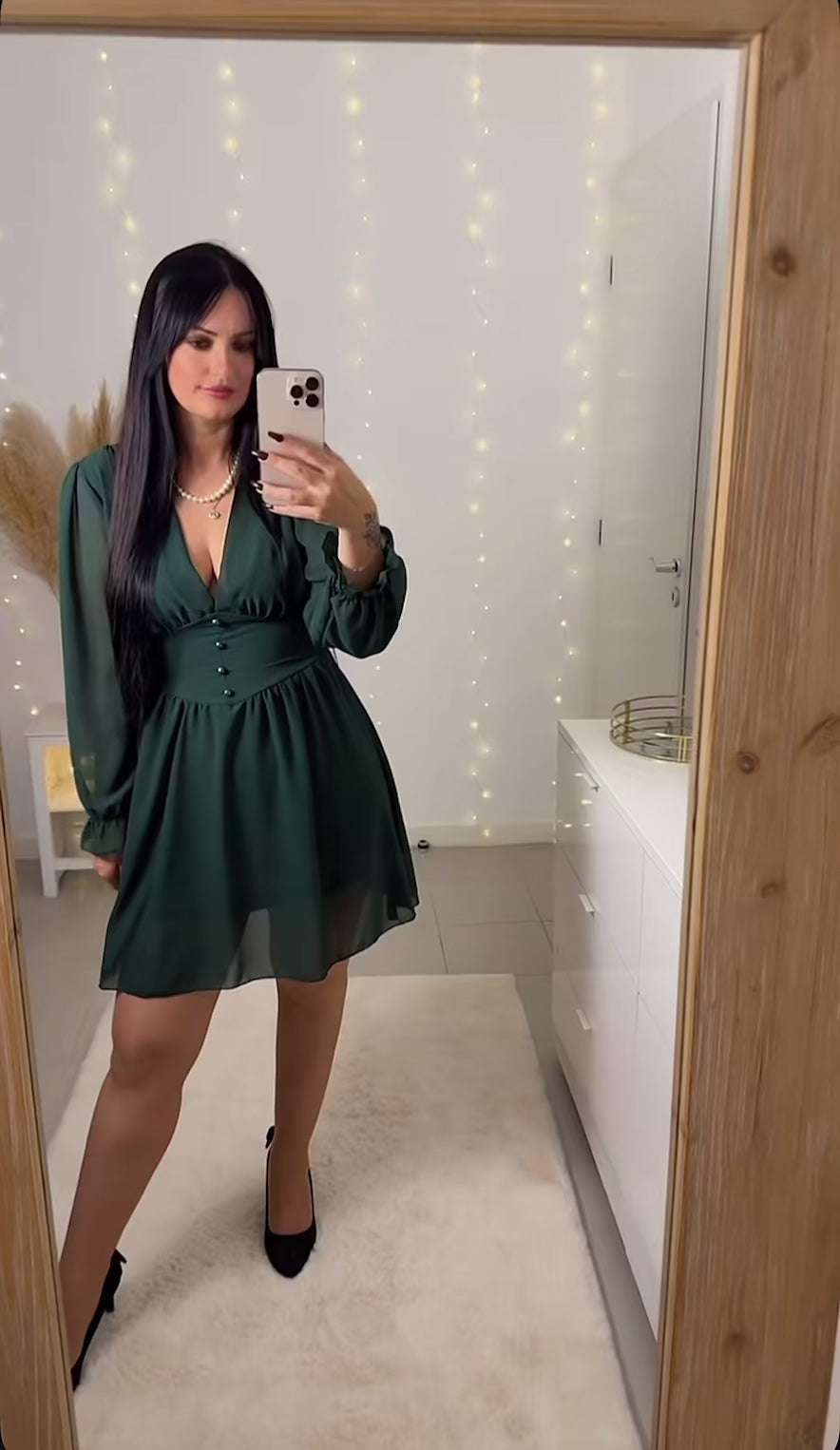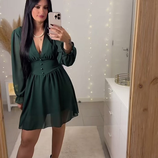 Robe Marley, verte, unie, avec manches longues, boutons et doublure en viscose.